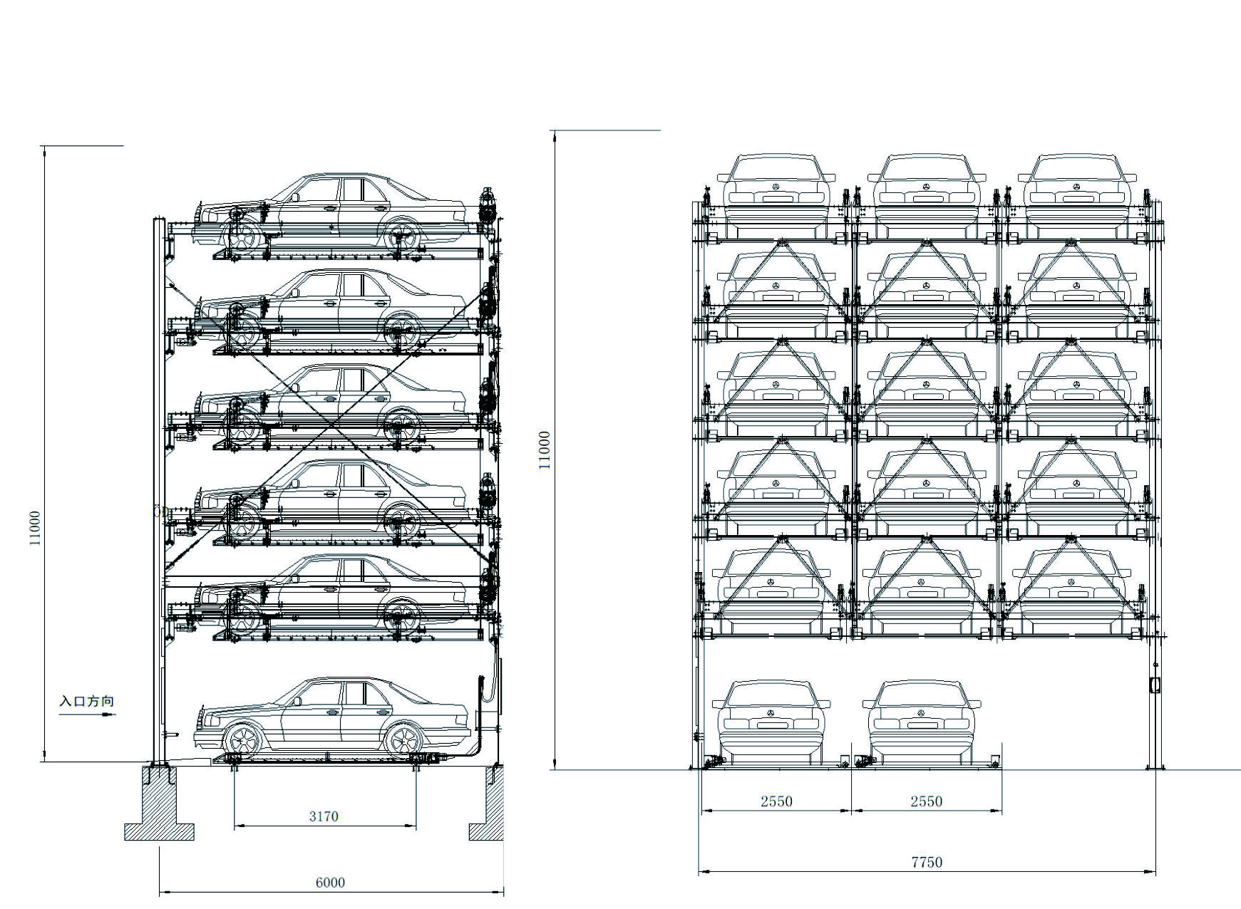 頂層載車板上下升降,底層載車板左右橫移,中間各層載車板既可上下升降,亦可左右橫移,通過PLC自動控制,完成存取車過程。